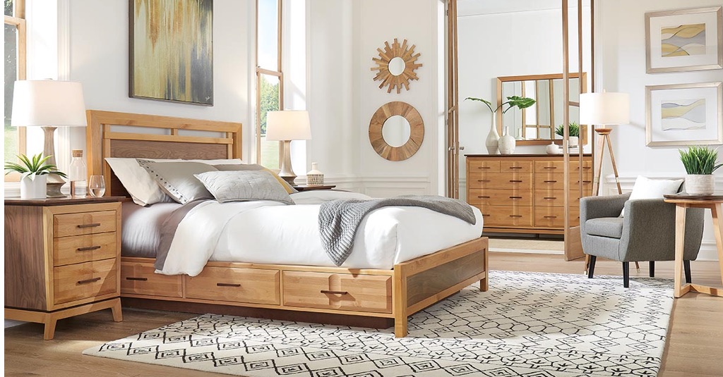 This collection was inspired by mid-century styling yet has a dramatic flair all its own. The remarkable combination of American Alder and Black Walnut hardwoods is stunning. Complementing this beautiful blend are bold design choices that set this group apart. A precisely engineered 45-degree miter face frame seamlessly surrounds spacious inset drawers. Coved drawer fronts exude solid wood and ensure the solid Black Walnut drawer pulls are a stand out feature. Beds offered in two styles for differing design aesthetics.