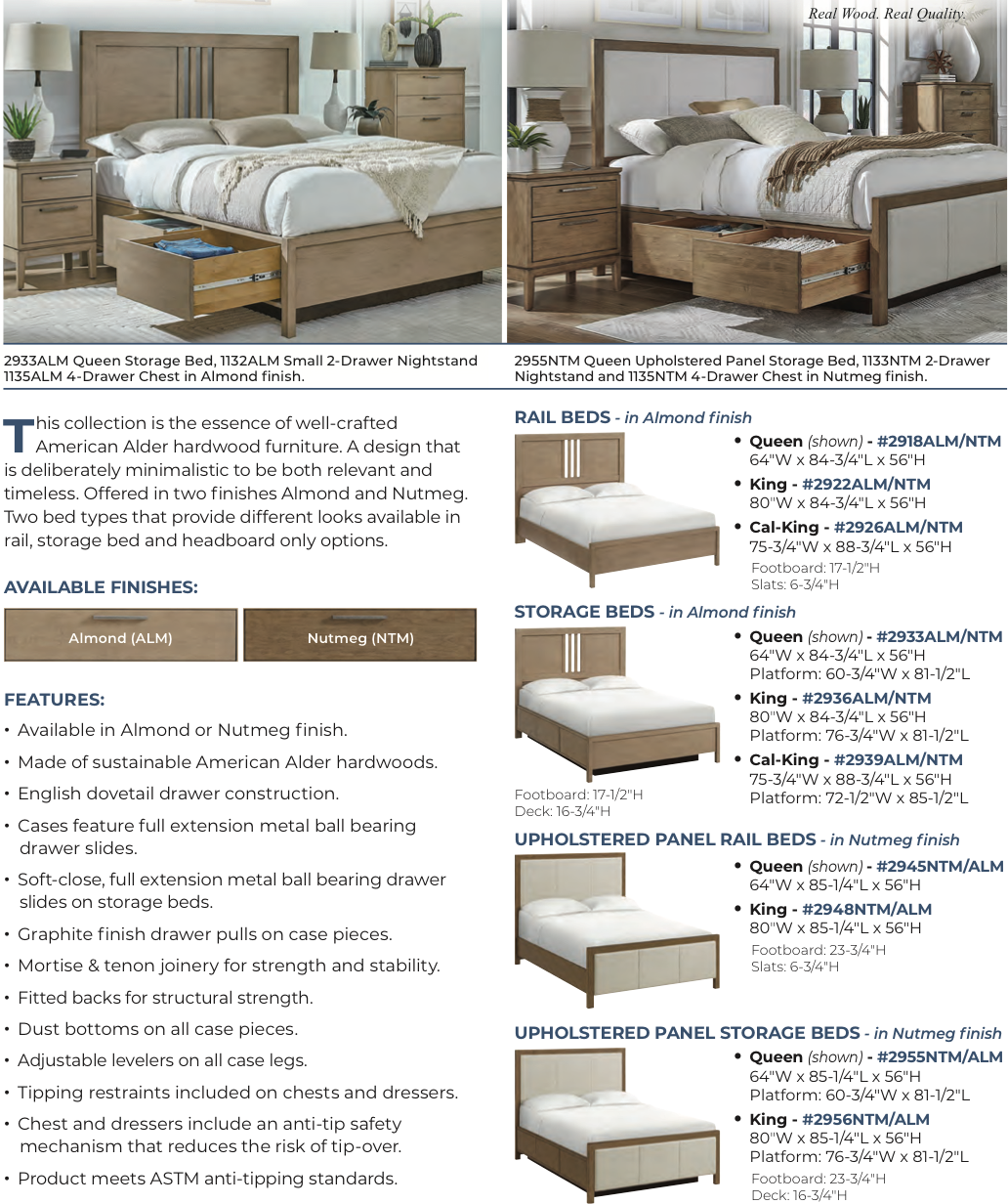 Bailey Bedroom Collection has a deliberate, minimalistic design that is both relevant and timeless. It is the essence of well-crafted, real wood furniture for today’s modern living. Two different earth-tone finish options combine with elongated drawer pulls in a graphite finish adding a touch of elegance to the design. The Nutmeg finish is reminiscent of the exotic spice, warm in tone. The Almond finish is a creamy beige, light and neutral. Created from American Alder hardwoods. English dovetail, solid wood drawer construction and full extension metal ball bearing drawer slides ensures longevity. Nightstands feature dual port USB. Two bed styles and two bed types offer different looks. One bed is solid wood with a slat detail and the other is an upholstered headboard and footboard combination. Both bed designs come in storage, rail and headboard only options. Headboard only option is compatible with most Hollywood bed frames.